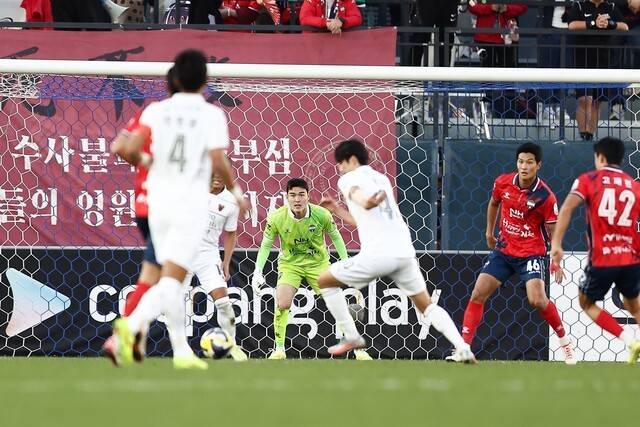 전반이 끝나갈 무렵 결정적인 장면이 나왔다. 포항의 수비 사이로 침투하는 고재현에게 이찬욱이 완벽한 스루패스를 찔러 넣었다. 이를 고재현이 슛으로 마무리했지만, 아쉽게 빗나가고 말았다. 포항도 크로스바를 스치는 슛으로 반격했다. 추가시간은 2분이 주어졌고, 득점 없이 전반전을 마쳤다.