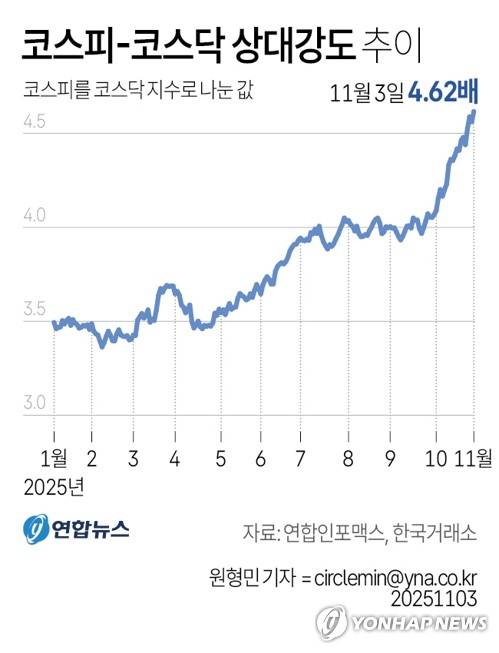 코스피를 코스닥 지수로 나눈 값인 상대강도는 4.62배로 역대 최고기록을 경신했다.