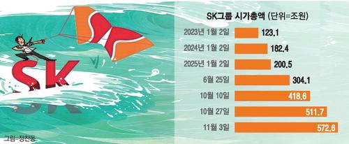 SK그룹 시가총액이 지난달 27일 500조원을 돌파한 데 이어 3일 572조원을 기록했다. 코스피 약 15%에 육박하는 규모다. 앞서 시총 400조원은 10월 10일 넘어섰다. 불과 3주가 채 되기 전에 100조원 이상 시총이 증가한 것이다. 특히 SK하이닉스의 질주가 무섭다. 3일 시총이 451조원으로, 올해 1월 초에 비해 3배 넘게 늘었다. SK가 국민 호주머니를 든든하게 채워주는 '효자'라는 얘기가 나오는 이유다.
