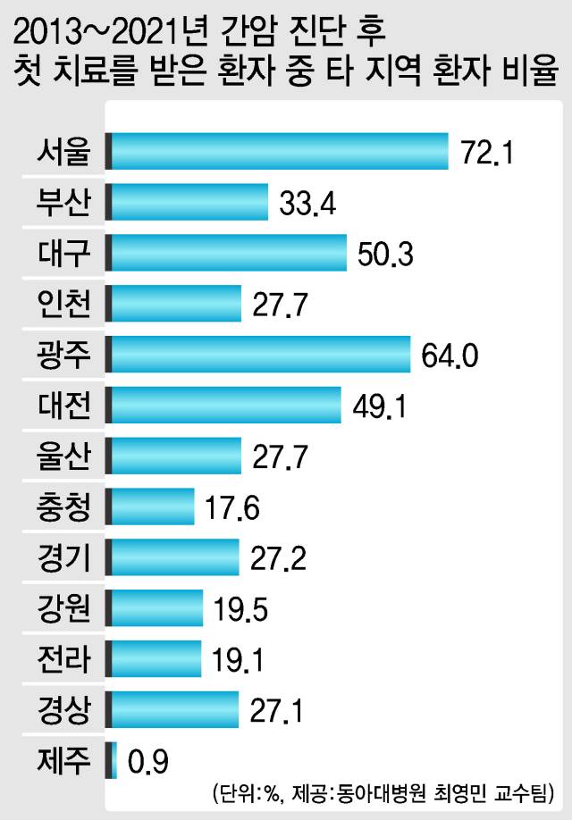거주지에서 간암 치료를 받는 경상도 환자 비율은 단 17.6%에 불과했으며, 부산 간암 환자가 거주지에서 치료 받는 비율도 절반에 그쳤다. 거주지 외 지역에서 치료받는 감암 환자 10명 중 7명은 ‘서울행’을 택한 것으로 나타나 의료 접근성 격차 해소를 위한 대응이 시급하다는 지적이다.