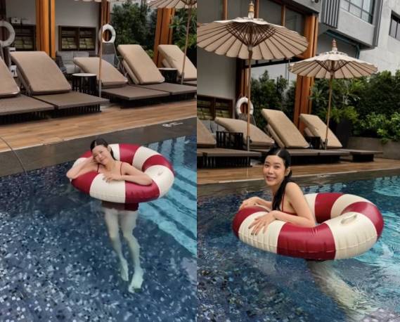 공개된 사진 속 린은 수영장에서 여유로운 휴식을 취하는 모습이다. 린은 걱정과 고민 없는 시간에 편안한 미소를 짓고 있기도.