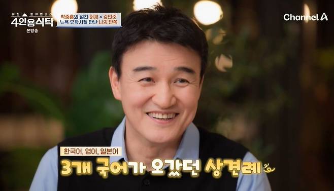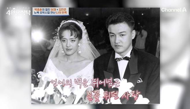 박경림이 "서로 언어가 다른데 상견례 때 어떻게 했냐"라고 묻자 박중훈은 "저희 부모님이 일제강점기 때 10대를 보내셔서 일본어를 잘하셨다. 저랑 아내는 서툴지만 영어로 했고"라며 3개 국어가 오갔다고 떠올렸다. 박중훈은 "지금은 한국어를 해서 괜찮은데, 전엔 영어로 해야 해서 다툼이 있어도 사전을 찾아봤다. 찾다가 웃었다"라고 전했다.