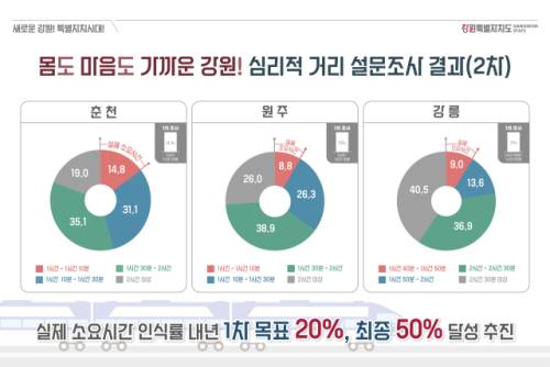 3일 강원자치도에 따르면 지난 9월 수도권 시민을 대상으로 ‘강원에 대한 심리적 거리감’ 2차 설문조사를 실시한 결과 서울~춘천·원주·강릉 간 소요시간을 실제보다 길게 느끼는 것으로 분석됐다.