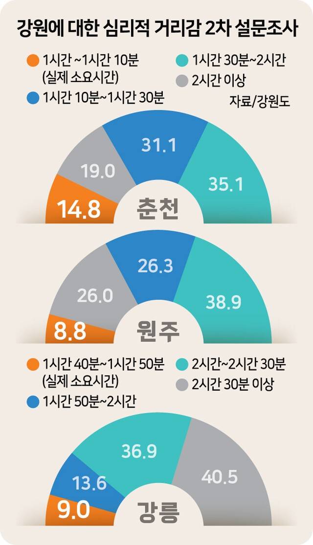 강원도가 3일 리얼미터에 의뢰해 서울 등 수도권 주민을 대상으로 한 설문조사 결과에 따르면, 응답자(517명)의 35.1%가 춘천~청량리 열차 이동시간이 최대 2시간에 이를 것이라 답했다. 2시간이 넘게 걸릴 것이란 응답도 19.0%에 달했다.
