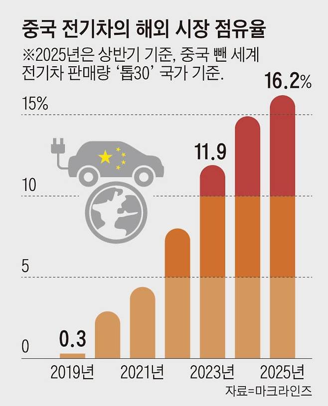2020년대 정부 보조금을 등에 업고 내수 시장의 90%를 장악한 중국 전기차 업체들은 이제 해외 공략에 사활을 걸고 있다. 시장조사 업체 마크라인스에 따르면, 중국을 뺀 글로벌 전기차 판매 상위 30국에서 중국 브랜드의 점유율은 2019년 0.3%에서 올해 상반기 16.2%로 수직 상승했다. 단 6년 만에 점유율이 54배로 뛴 것이다. 태국·말레이시아·이스라엘 같은 신흥 전기차 시장은 점유율이 80%를 웃돌고, 브라질에선 무려 99.5%라는 경이적인 수치를 기록했다.