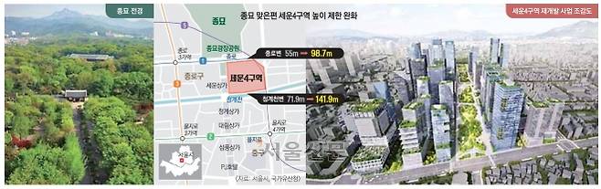 서울시는 지난달 30일 ‘세운재정비촉진지구 및 4구역 재정비촉진계획 결정(변경) 및 지형도면’을 시보에 고시했다. 이에 따르면 세운4구역의 건물 최고 높이는 종로 변 55m(변경 전)→98.7m(변경 후), 청계천 변 71.9m(전)→141.9m(후)로 바뀌었다. 청계천 변을 기준으로 보면 건물 최고 높이가 배 가까이 증가하는 셈이다.