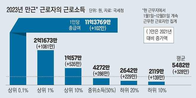 반면 소득 하위 20%는 2642만원, 하위 10%는 2119만원에 그쳤다. 전체 임금근로자의 평균 근로소득은 5482만원, 중위소득은 4272만원이었다. 중위소득이란 소득을 1등부터 순서대로 줄 세웠을 때 한가운데에 있는 소득이다.