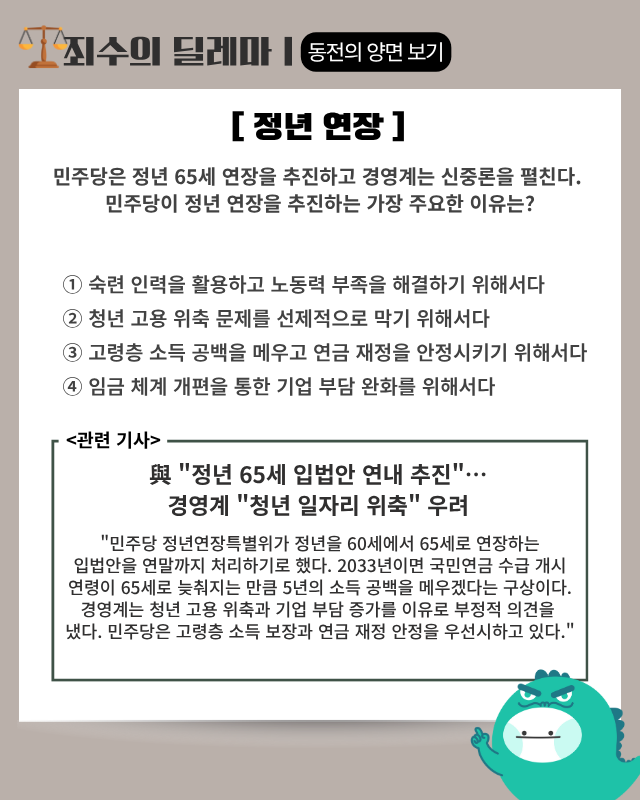 ▶기사 바로가기: 與 “정년 65세 입법안 연내 추진”···경영계 “청년 일자리 위축” 우려
