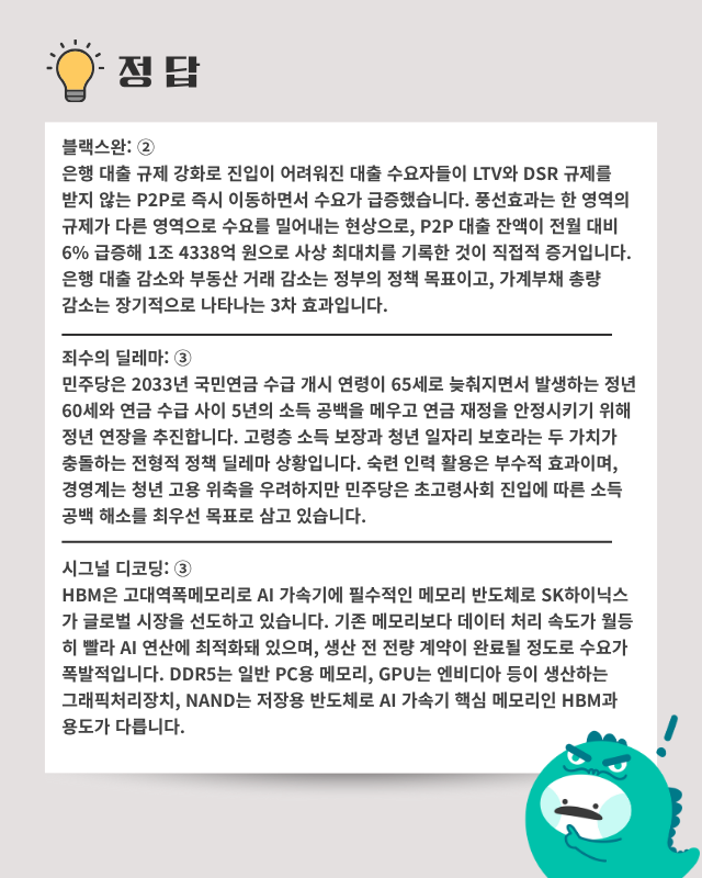 ■ P2P 대출 급증과 풍선효과 경계 필요: 온라인투자연계금융업(P2P) 대출 잔액이 1조 4338억 원으로 사상 최대치를 기록하며 전월 대비 6% 증가했다. 정부의 가계대출 규제로 은행권 대출이 어려워진 실수요자들이 LTV·DSR 규제를 받지 않는 P2P로 몰리고 있으며, P2P 채권 투자자들은 차주의 신용도 악화 가능성을 고려한 리스크 관리가 필요하다.