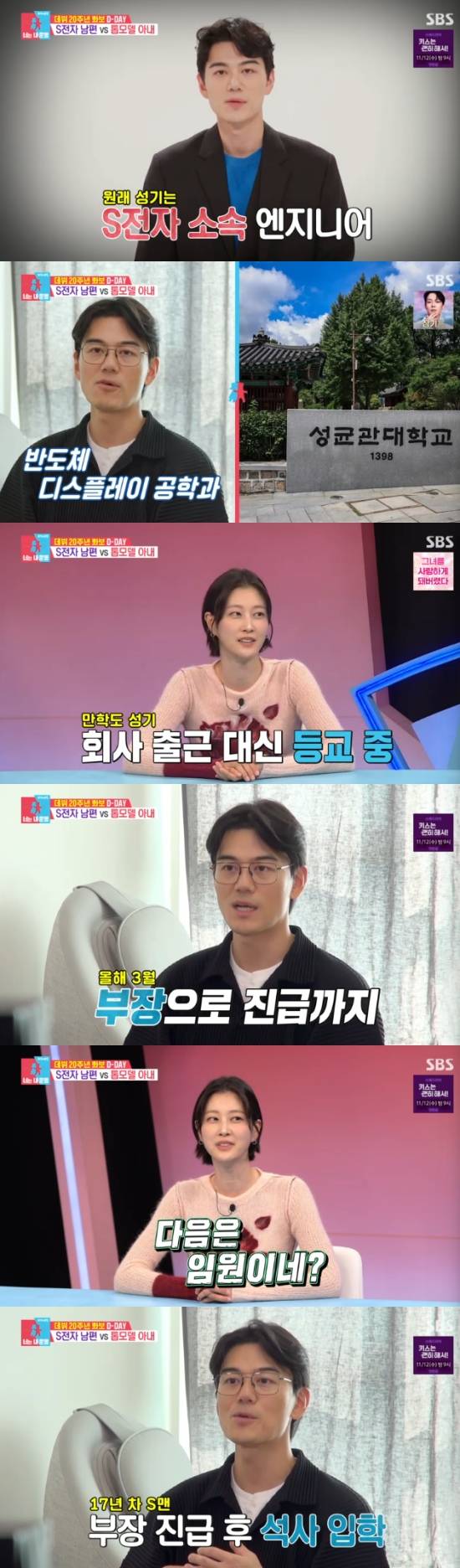 홍성기는 "올해 3월에 부장으로 진급을 했다. 입사 17년만"이라면서 "지금은 회사 양성 과정 중 하나로 성균관대학교 반도체 디스플레이 공학과 석사과정 중이다. 2학기 째 다니고 있다. 월급도 나오고, 학비도 회사에서 지원을 해준다"고 전했다.
