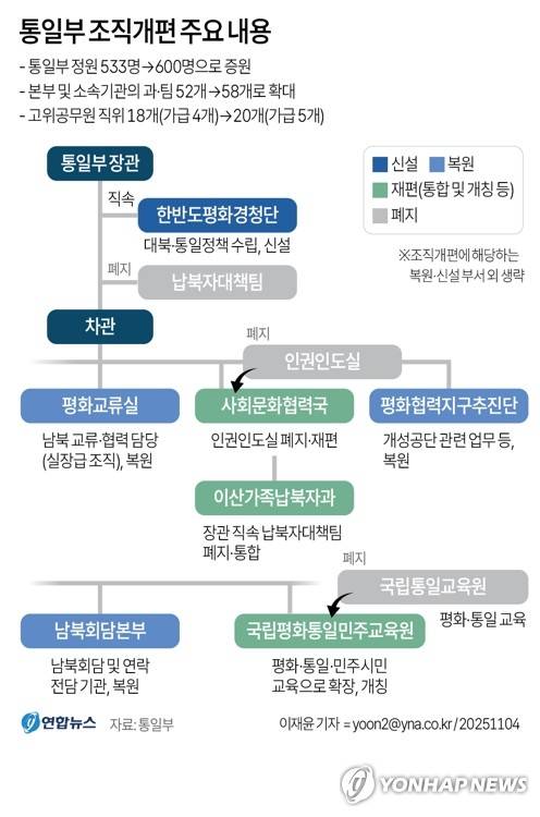 (서울=연합뉴스) 이재윤 기자 = 윤석열 정부 때 폐지된 통일부 남북회담본부가 2년 만에 부활했고, 북한인권 비판에 초점을 맞췄던 인권인도실은 폐지됐다.