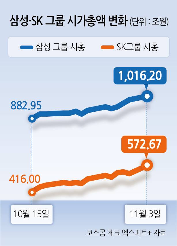 삼성과 SK 두 그룹의 합산 시가총액이 사상 처음으로 1500조원을 돌파했다.