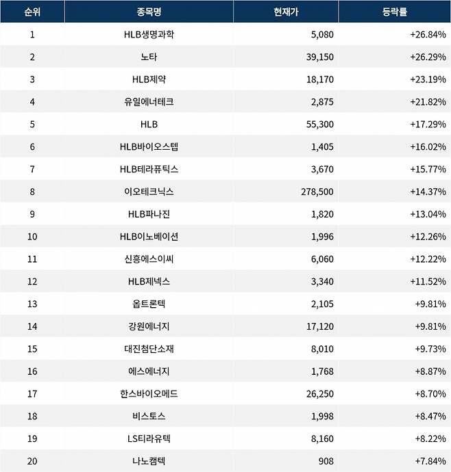 6위 HLB바이오스텝(278650)은 현재가 1,405원으로 16.02% 급등 중이다. 7위 HLB테라퓨틱스(115450)는 현재가 3,670원으로 15.77% 급등 중이다. 8위 이오테크닉스(039030)는 현재가 278,500원으로 14.37% 급등 중이다. 9위 HLB파나진(046210)은 현재가 1,820원으로 13.04% 급등 중이다. 10위 HLB이노베이션(024850)은 현재가 1,996원으로 12.26% 급등 중이다.
