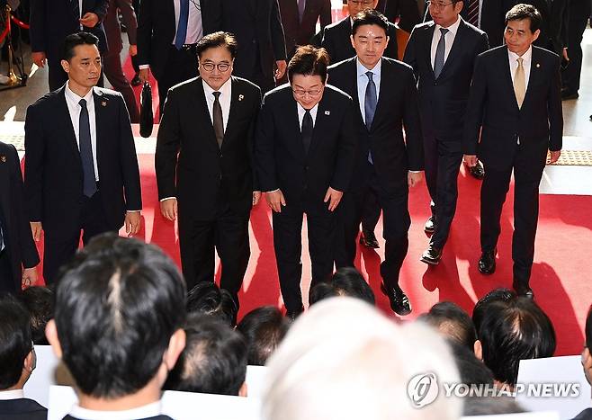 (서울=연합뉴스) 이재명 대통령이 4일 내년도 정부 예산안에 대한 시정연설을 하기 위해 서울 여의도 국회에 도착해 피켓시위를 하는 국민의힘 의원들 앞을 지나고 있다. 국민의힘 의원들은 추경호 전 원내대표에 대한 내란특검팀의 영장청구에 반발하며 야당 탄압 중단을 촉구했다. 2025.11.4 [국회사진기자단]