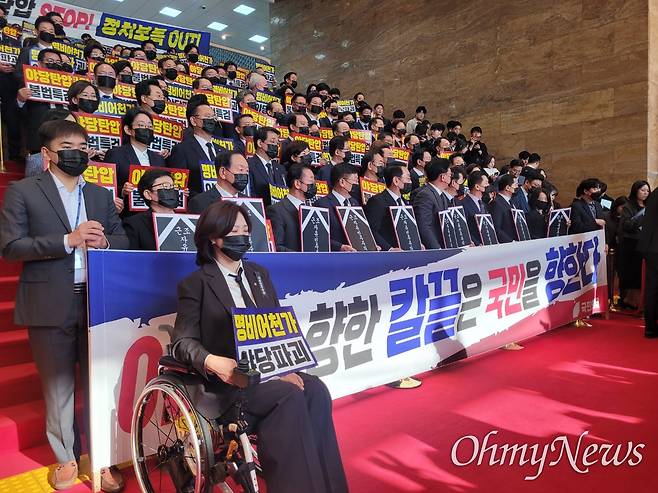 최수진 국민의힘 원내수석대변인은 의원총회 후 취재진에게 "국민의힘은 국회 본회의장에 들어가지 않는 것으로 결정했다"면서 "(본회의장 앞) 로텐더홀에서 강력 규탄할 예정"이라고 전했다. 이들은 검은 마스크를 착용하고 침묵 시위를 할 예정이라고 한다.