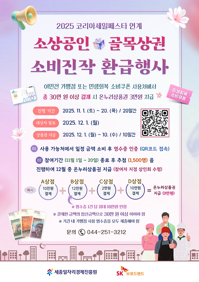 행사는 구매 영수증을 세종시청(sejong.or.kr) 또는 진흥원(sjepa.or.kr) 누리집에 게시된 홍보물의 QR코드를 통해 인증하면 된다.