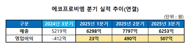 에코프로비엠 3분기 영업익 507억원…3개 분기 흑자