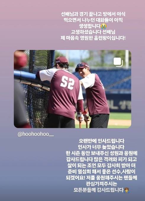박병호의 은퇴 소식이 전해지자 그를 진심으로 존경하며 따랐던 이정후가 SNS를 통해 입을 뗐다.