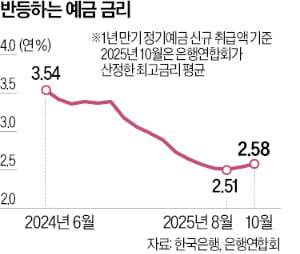 이 같은 변화에 따라 1금융권 정기예금 최고금리는 연 2.58%(37개 상품 평균)까지 올랐다. 9월 말(연 2.54%)보다 0.04%포인트 높다. 수익률이 가장 높은 상품은 SC제일은행의 ‘e-그린세이브예금’(최고 연 2.85%)이다. 수협은행의 ‘SH첫만남우대예금’(연 2.8%)도 꾸준히 상위권에 올라 있다.