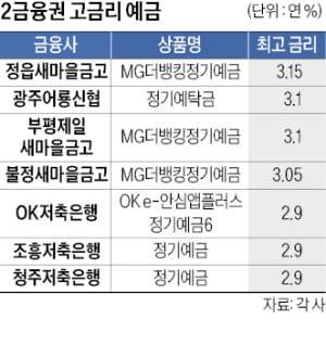 이전보다 고금리 예금이 줄어든 2금융권과는 대조적이다. 지난 9월까지만 해도 최고 금리가 연 3.2~3.7%인 예금이 여럿 있었지만 지금은 모두 자취를 감췄다. 1년 만기 기준으로 가장 높은 금리가 연 3.15%(정읍새마을금고 MG더뱅킹정기예금)다. 광주어룡신협(연 3.1%), 인천 부평제일새마을금고(연 3.1%), 충북 괴산 불정새마을금고(연 3.05%) 등이 그 뒤를 잇고 있다.