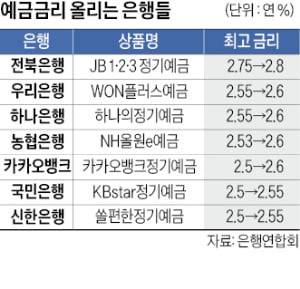 국민(최고 연 2.55%) 신한(연 2.55%) 하나(연 2.6%) 등 다른 시중은행도 비슷한 시기에 예금 금리를 0.1~0.15%포인트 인상했다. 농협은행(연 2.6%)과 카카오뱅크(연 2.6%), 케이뱅크(연 2.55%)도 최근 예금 금리를 올렸다.