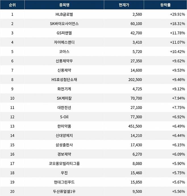 6위 신풍제약우(019175)는 종가 27,350원으로 9.62% 상승 마감했다. 7위 신풍제약(019170)은 종가 14,600원으로 9.53% 상승 마감했다. 8위 HS효성첨단소재(298050)는 종가 202,500원으로 9.46% 상승 마감했다. 9위 화천기계(010660)는 종가 4,725원으로 9.12% 상승 마감했다. 10위 SK케미칼(285130)은 종가 70,700원으로 7.94% 상승 마감했다.
