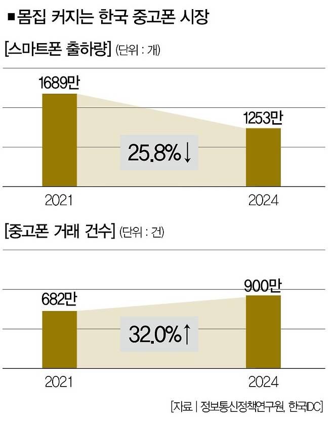 흥미로운 점은 중고폰 가격이 비싸졌는데도 시장은 여전히 활기를 띠고 있다는 거다. 특히 국내 시장이 그렇다. 정보통신정책연구원에 따르면 지난해 국내 중고폰 거래 건수는 900만건으로 3년 전인 2021년(682만건)보다 32.0% 증가했다. 같은 기간 국내 스마트폰 출하량이 1689만개에서 1253만개로 25.8% 감소한 것을 생각하면 유의미한 수치다. 신제품 못지않게 중고폰을 찾는 소비자가 늘었다는 얘기다.