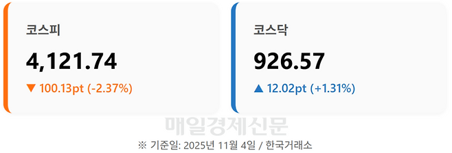 ![4일 서울 중구 하나은행 딜링룸 현황판에 코스피 등이 표시되고 있다. [연합뉴스]](https://img3.daumcdn.net/thumb/R658x0.q70/?fname=https://t1.daumcdn.net/news/202511/04/mk/20251104161839265sxdr.png)