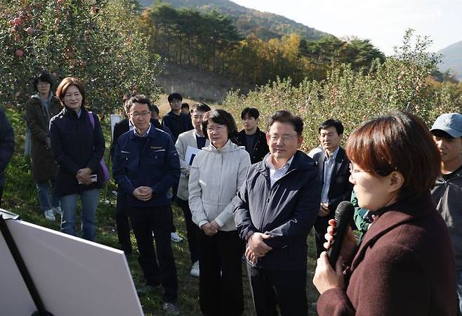 [서울=뉴시스] 이승돈 농촌진흥청장은 4일 경북 영천시의 사과 재배 농가를 방문해 농촌진흥청 국립농업과학원이 개발한 미생물제 '메소나'를 적용한 재배 현황을 점검하고 있다. (사진=농촌진흥청 제공) 2025.11.04. photo@newsis.com *재판매 및 DB 금지