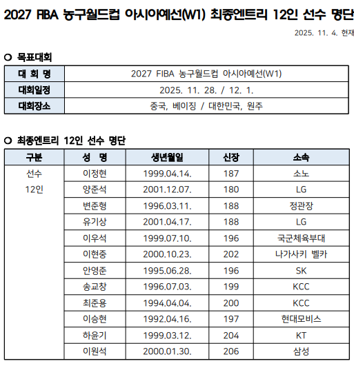 대한농구협회는 4일 2027 국제농구연맹(FIBA) 농구 월드컵 아시아 예선을 준비할 한국 대표팀 12인 최종 명단을 발표했다.