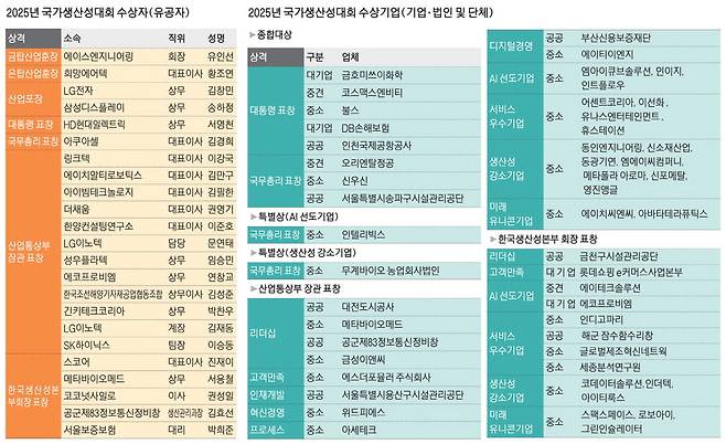 올해 국가생산성대상 유공자 부문에서 금탑산업훈장은 유인선 에이스엔지니어링 회장이 받았다. 은탑산업훈장은 황조연 희망에어텍 대표이사, 산업포장은 김창민 LG전자 상무와 송하정 삼성디스플레이 상무가 각각 받았다. 대통령 표창은 서영천 HD현대일렉트릭 상무, 국무총리 표창은 김경희 아쿠아셀 대표이사에게 돌아갔다.
