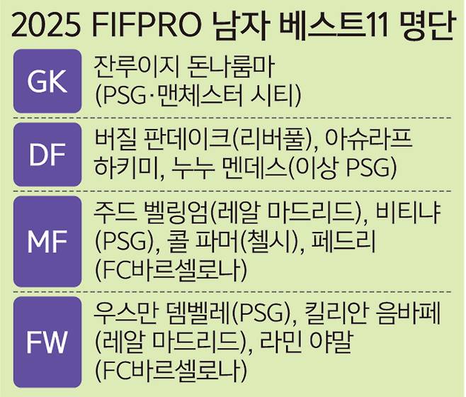 FIFPRO는 4일 홈페이지를 통해 ‘2025 월드 베스트 11’ 명단(남자 11명·여자 11명)을 발표했다. 지난달 28일 68개국 2만6000명 이상 남녀 프로 선수들의 직접 투표로 결정한 최종후보 명단(남자 26명·여자 26명)을 공개했던 FIFPRO는 이날 최종 명단을 내놨다.
