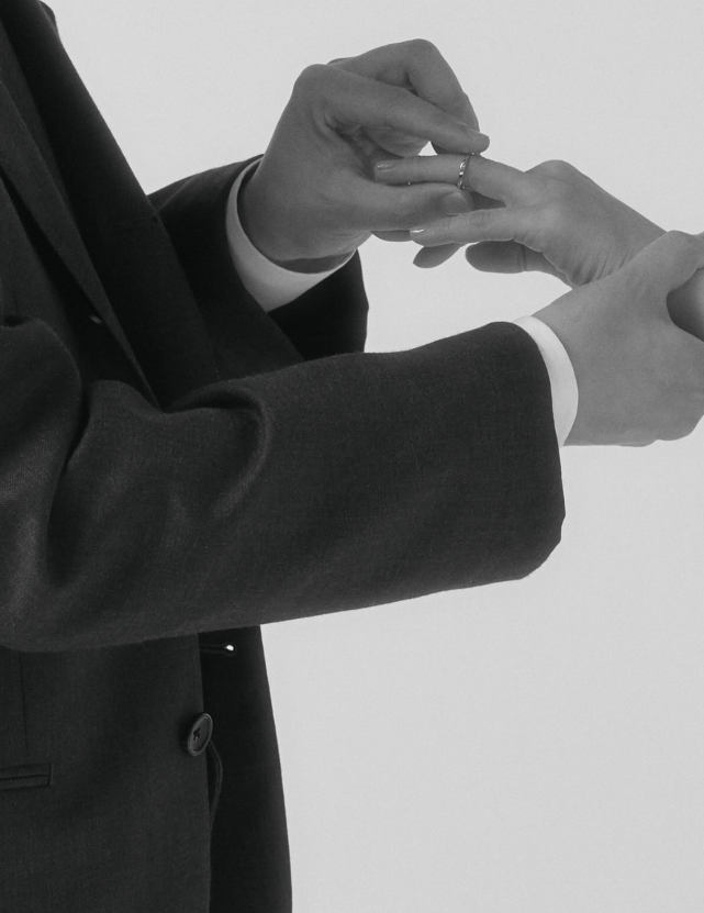 정장 차림의 남성이 함은정의 손가락에 반지를 끼워주는 흑백 사진은, 사랑이 약속으로 바뀌는 찰나의 감정을 섬세하게 담아냈다.