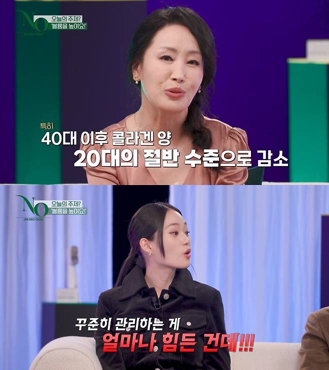 이에 조광현 전문의는 "얼굴 노화의 대표적인 증상이 피부 탄력 저하로 볼륨이 손실되는 것"이라며 "나이가 들면 콜라겐, 엘라스틴, 지방이 감소하며 피부가 처지고 재배치가 이루어지기 때문"이라고 설명했다. 한국피부과학연구원 안인숙 원장 역시 "40대 이후 콜라겐 양은 20대의 절반 수준으로 감소한다"라고 덧붙여 '팀 진서연'을 다시 한번 충격에 빠뜨렸다.