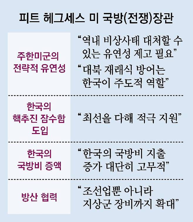 헤그세스 “韓에 핵억제 계속 제공… 대북 재래식 방어는 韓이 주도해야”