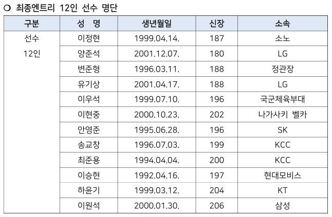 대한민국농구협회는 중국과 2연전으로 치러지는 FIBA 농구 월드컵 아시아 예선에 출전할 국가대표 12인 명단을 4일 발표했다.