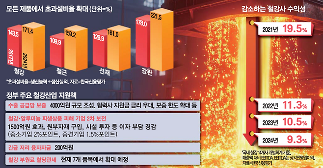 하지만 글로벌 공급 과잉, 내수 수요 부진 등 철강산업의 구조적인 환경 변화를 고려하면 구조 재편 속도를 높여야 한다는 목소리도 커지고 있다. 지난해 말 국내 주요 철강 기업 14개사의 매출액 대비 상각전영업이익(EBITDA)은 9.3%로 집계됐다. 2021년 19.5%, 2022년 11.3%, 2023년 10.5%에서 꾸준히 감소하고 있다.