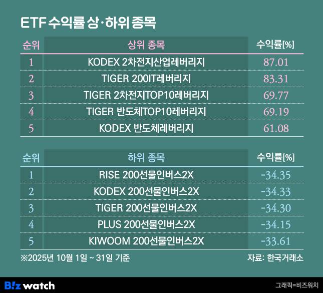 다만 삼성운용의 KODEX 2차전지산업레버리지 한 달 수익률은 87.01%로 1위를 기록했다. 미래에셋운용의 TIGER 2차전지TOP10레버리지수익률도 69.77%로 3위를 기록했다.