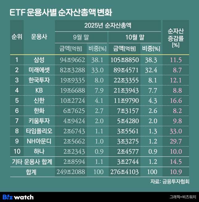 운용사별로는 삼성운용의 순자산총액이 105조8850억원으로 국내 자산운용사 중 처음으로 100조원을 돌파했다. 지난 9월(94조9662억원)보다 11.5%(10조9188억원) 증가한 수치다.