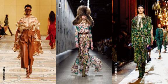 자유로운 보헤미안 무드를 대표하는 페이즐리 패턴은 이번 시즌 한층 깊고 클래식하게 돌아왔다. 드리스반노튼은 페이즐리 셋업 위에 정교한 보석 장식을 가미해 쿠튀르적인 터치를 완성했고, 에트로는 실크 드레스에 유려한 곡선 패턴을 입혀 브랜드의 시그니처를 새롭게 해석했다. 짐머만은 러플 블라우스와 가죽 팬츠를 믹스해 로맨틱하면서도 강렬한 대비를 보여줬다. 이국적인 무드를 현대적으로 즐기고 싶다면 채도가 낮은 컬러로 톤을 맞춰보자. 과하지 않으면서도 세련된 인상을 줄 수 있다.