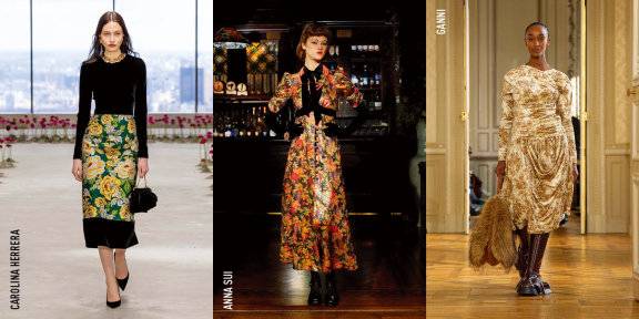 올해 F/W 런웨이에서는 오래된 유럽 시골집의 벽지를 연상시키는 빈티지 플로럴이 부상했다. 클래식한 로맨티시즘과 함께 과거의 낭만을 현재의 감도로 재해석한 것. 안나수이는 자카드 원단 위에 장미 패턴을 더해 앤티크한 분위기를 연출했고, 버버리는 작은 꽃무늬 퀼팅 셋업으로 포근하면서도 따뜻한 감성을 드러냈다. 월 플라워 프린트를 일상 속에서 부담 없이 즐기고 싶다면, 캐롤리나헤레라의 룩을 참고해볼 것. 베이식한 블랙 톱에 플라워 스커트를 매치해 정제된 우아함을 표현했다.