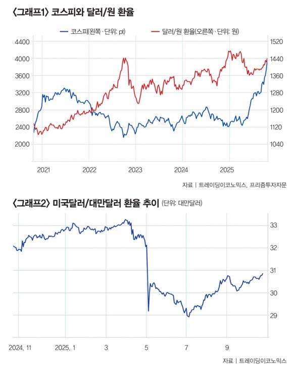 과거 환율과 주가가 반대 방향으로 움직인 것은 외국인투자자의 순매수 때문이었다. 외국인은 올해 9월 말 기준 한국 주식의 28.7%를 쥐고 있는 사실상 대주주로, 이들의 매매는 주식시장은 물론 외환시장에 즉각적인 영향을 미친다. 2025년 기준 대기업 집단의 내부지분율(전체 발행 주식 가운데 기업의 소유주나 법인, 특수관계인 등이 보유한 주식 비율)이 62.4%라는 점을 감안하면 한국 대기업의 유통 주식은 대부분 외국인이 가지고 있는 셈이다. 내부지분은 상장이나 기업 인수합병, 상속 같은 특별한 조건이 아닌 한 시장에 풀리지 않기 때문이다.