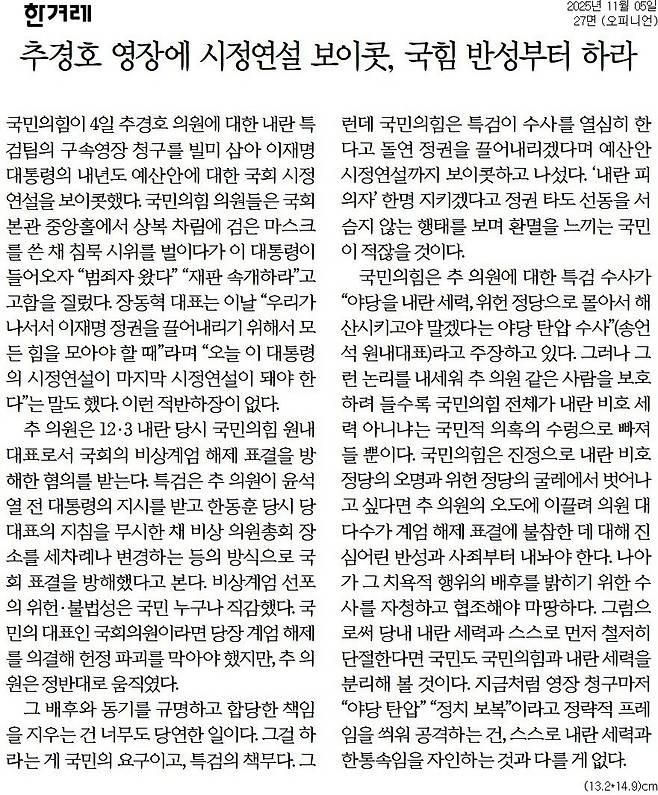한겨레 = 추경호 영장에 시정연설 보이콧, 국힘 반성부터 하라