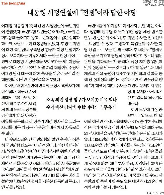 중앙 = 대통령 시정연설에 "전쟁"이라 답한 야당
