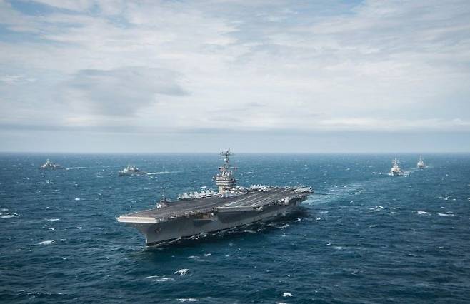 5일 해군에 따르면 조지워싱턴함 등 미 해군 제5항모강습단이 이날 군수 적재, 승조원 휴식 등을 위해 부산작전기지에 입항했다.