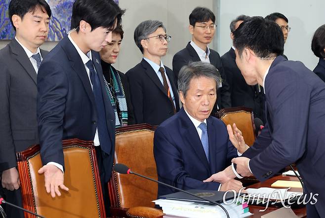 "형사소송법 규정에 맞는 선서를 하겠다"라며 개별 선서를 주장하는 김 상임위원을 향해 여당 의원들은 "회의를 방해하고 있다", "퇴장 조치하고 고발하자"라며 소리치며 항의했다. "소모적 논쟁을 이어가지 않겠다"던 김병기 운영위원장은 김 상임위원을 퇴장 조치했다. 국정감사가 시작된 지 10여 분 만이었다.