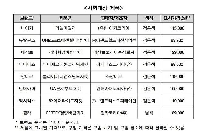 제품 가격은 8만9000원(아디다스)에서 19만9000원(데상트)까지 2.2배 이상 차이가 났다. 소비자원은 가격·체온유지성·통풍성·발수성 등을 종합적으로 고려했을 때 나이키 리펠마일러 제품이 가격 대비 품질이 가장 양호하다고 평가했다.