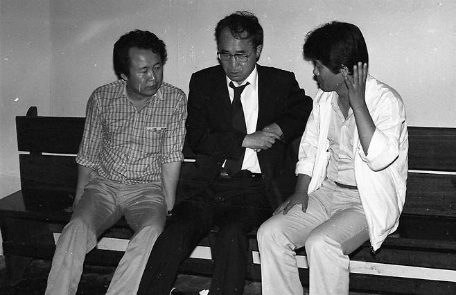 | ▲ 1987년 채광석 시인이 사고로 서거하자 동료 문인들과 장례를 논의하는 최민화(맨 왼쪽) |
