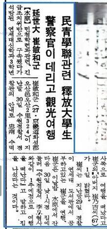 수원경찰서에서 마포경찰서로 신병이 인계되던 날, 이화여대 입구 건너편 대흥극장 앞에는 마포서 정보계장을 대동한 황영하 정보과장이 나와 있었다. 수원경찰서 직원이 황용하 정보과장에게 보고하는 사이, 옆에 있던 정보계장이 턱으로 최민화를 가리키며 물었다.
