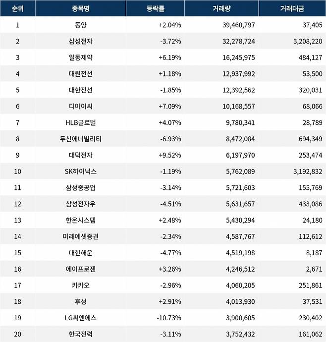 한편 거래량 상위 20위권 종목들은 삼성중공업(010140) ▼3.14%, 삼성전자우(005935) ▼4.51%, 한온시스템(018880) ▲2.48%, 미래에셋증권(006800) ▼2.34%, 대한해운(005880) ▼4.77%, 에이프로젠(007460) ▲3.26%, 카카오(035720) ▼2.96%, 후성(093370) ▲2.91%, LG씨엔에스(064400) ▼10.73%, 한국전력(015760) ▼3.11% 등의 성적을 기록했다.